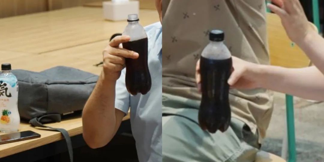 從溝通會現(xiàn)場的圖片來看,新品被撕去了標簽,只能看到“可樂顏色”的液體,瓶型與以往氣泡水一致。
