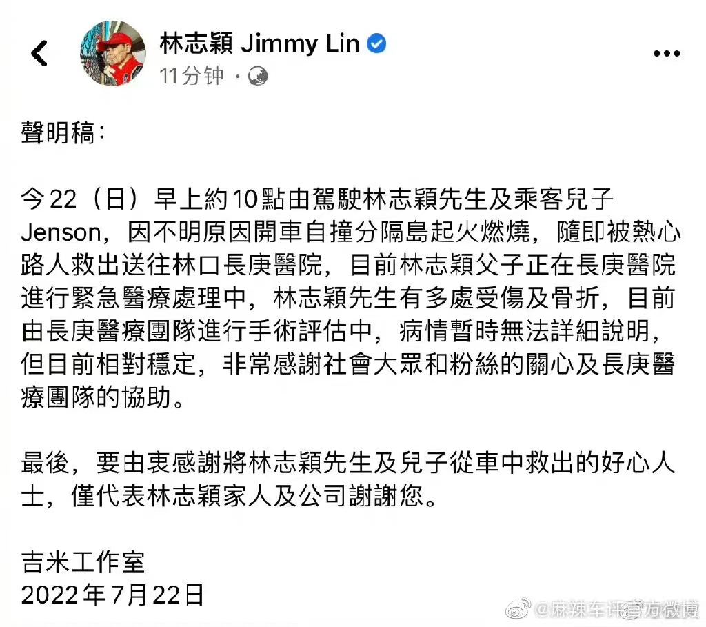 林志穎弟弟當(dāng)天(7月22日)下午發(fā)布記者會,現(xiàn)場感謝熱心勇敢民眾的幫忙,并透露了林志穎目前傷勢穩(wěn)定,但狀況暫不明確,接下來兩三天是重點(diǎn)。