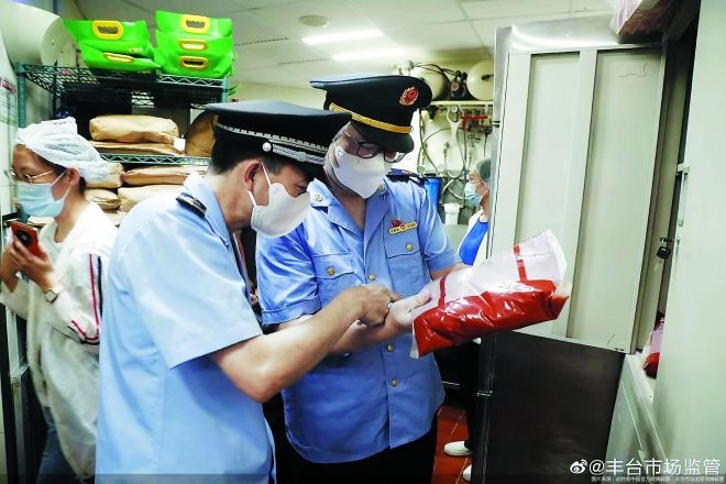 北京豐臺區(qū)市場監(jiān)管局執(zhí)法人員現(xiàn)場對食品原材料、半成品等食品的保質(zhì)期限、使用和庫存情況、從業(yè)人員的生產(chǎn)加工操作過程等進(jìn)行全面檢查。