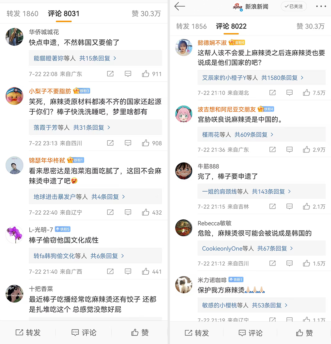 評(píng)論區(qū)里網(wǎng)友們都很激動(dòng),一方面,民族自豪感爆棚,中國的小吃果然有旺盛的生命力,這也讓從業(yè)者感到認(rèn)可;另一方面,不少網(wǎng)友擔(dān)心這波操作會(huì)如同當(dāng)年的“筷子之爭”、“豆?jié){之爭”、“端午節(jié)之爭”,擔(dān)心“麻辣燙會(huì)不會(huì)被韓國申遺”,并表示“請保護(hù)我方麻辣燙,盡快申遺”。這呼聲非常高,甚至一度“蓋過”前者。