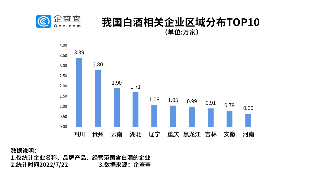 企查查數(shù)據(jù)顯示,從區(qū)域分布來看,四川以3.39萬家白酒相關(guān)企業(yè)排名第一。貴州、云南分別有2.80萬家、1.90萬家白酒相關(guān)企業(yè),位居前三。此后依次為湖北、遼寧、重慶、黑龍江等。
