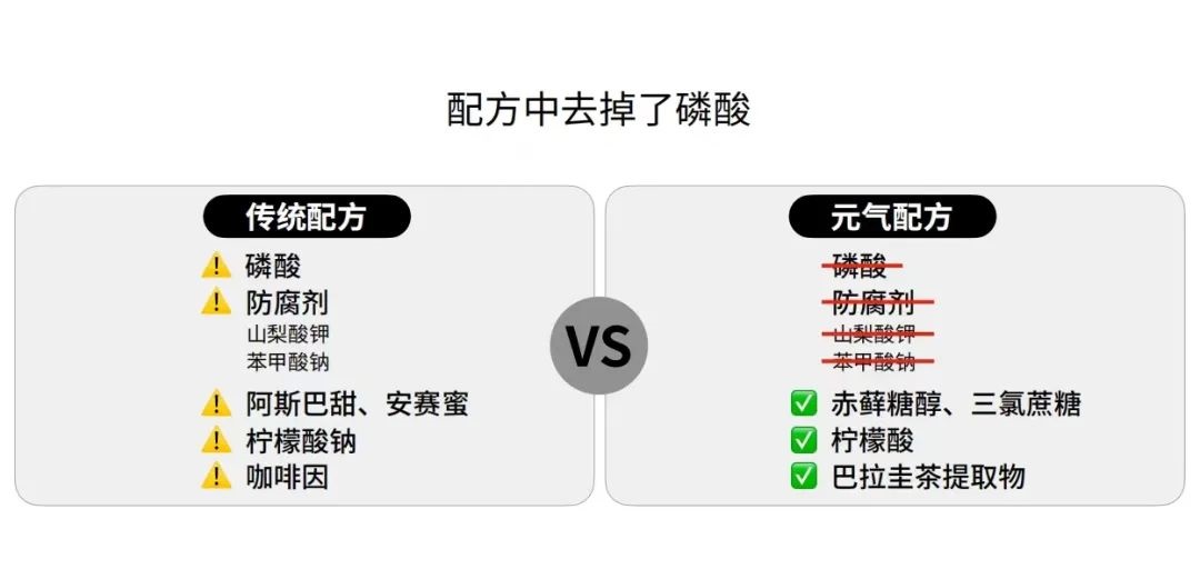 據(jù)元?dú)馍致?lián)合創(chuàng)始人鹿角介紹:首先,元?dú)馍譀Q定去掉傳統(tǒng)可樂配方的磷酸,原因在于有研究表明,過量攝入磷酸鹽對(duì)人體骨骼和心腦血管都有一定危害;其次,元?dú)馍秩コ吮郊姿徕c、山梨酸鉀等傳統(tǒng)可樂常用的化學(xué)防腐劑;最后,元?dú)馍诌盡量使用更加天然的配料來提升口感和健康度,比如用從玉米等農(nóng)作物提取的天然代糖赤蘚糖醇,取代了傳統(tǒng)可樂常用的人工代糖阿斯巴甜,用天然的檸檬酸取代檸檬酸鈉,用巴拉圭茶提取物取代傳統(tǒng)可樂的人工咖啡因。