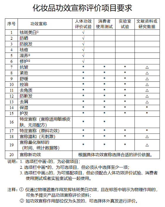 新規(guī)范和規(guī)定中,對功效宣稱更加嚴(yán)格,更加強(qiáng)調(diào)功效宣稱的科學(xué)性、準(zhǔn)確性與可靠性,對特定的功效,新增功效宣稱評價試驗(yàn),還包括人體功效評價實(shí)驗(yàn)、消費(fèi)者使用測試、實(shí)驗(yàn)室實(shí)驗(yàn)、文獻(xiàn)資料或研究數(shù)據(jù)等諸多要求。