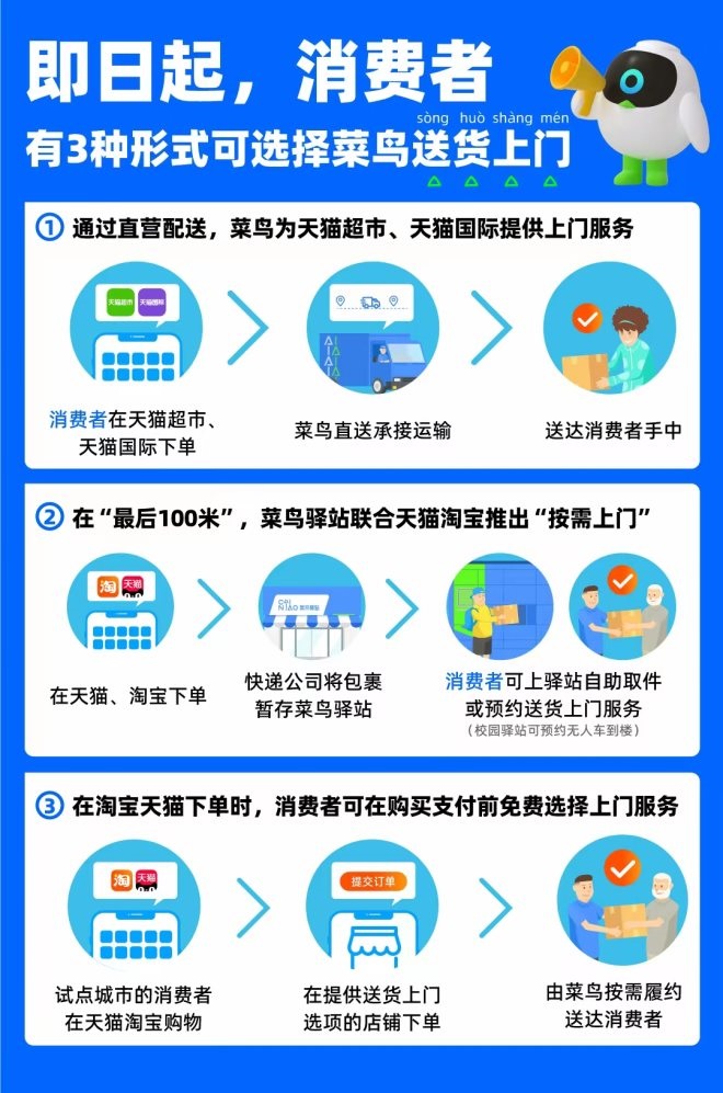 為了給消費(fèi)者以更多優(yōu)質(zhì)體驗和更多場景的選擇,菜鳥目前已在多個物流場景提供“送貨上門”服務(wù)。