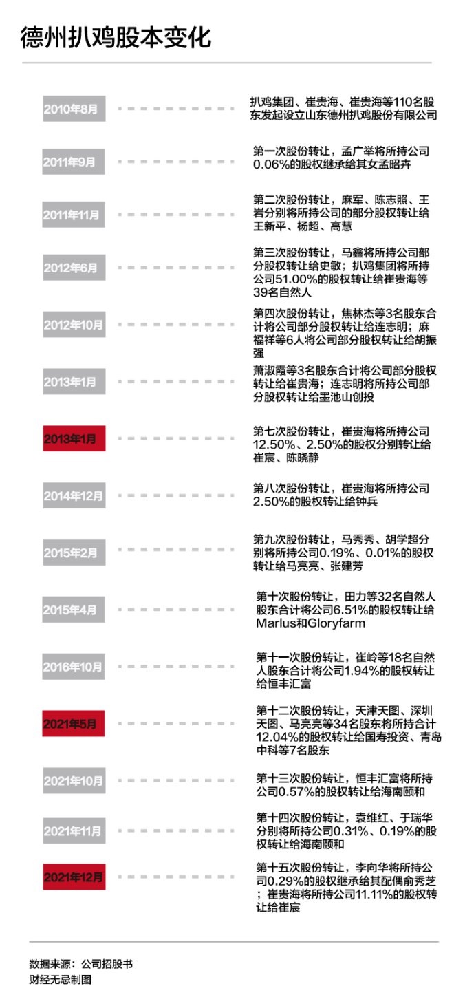 隨后的十多年里,通過十五次股權(quán)轉(zhuǎn)讓,德州扒雞成為了一家“家族企業(yè)”。