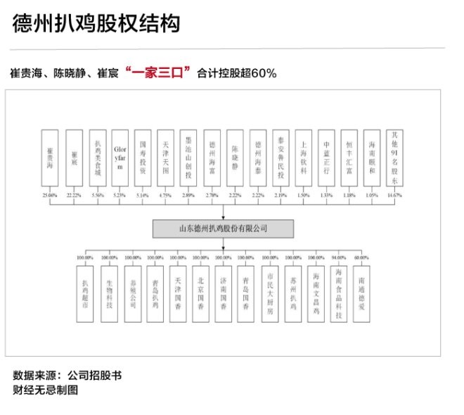 據(jù)招股書,崔貴海、陳曉靜、崔宸三人持有德州扒雞股權(quán)比例分別為25.06%、2.22%與22.22%,一家三口合計(jì)控股超60%。