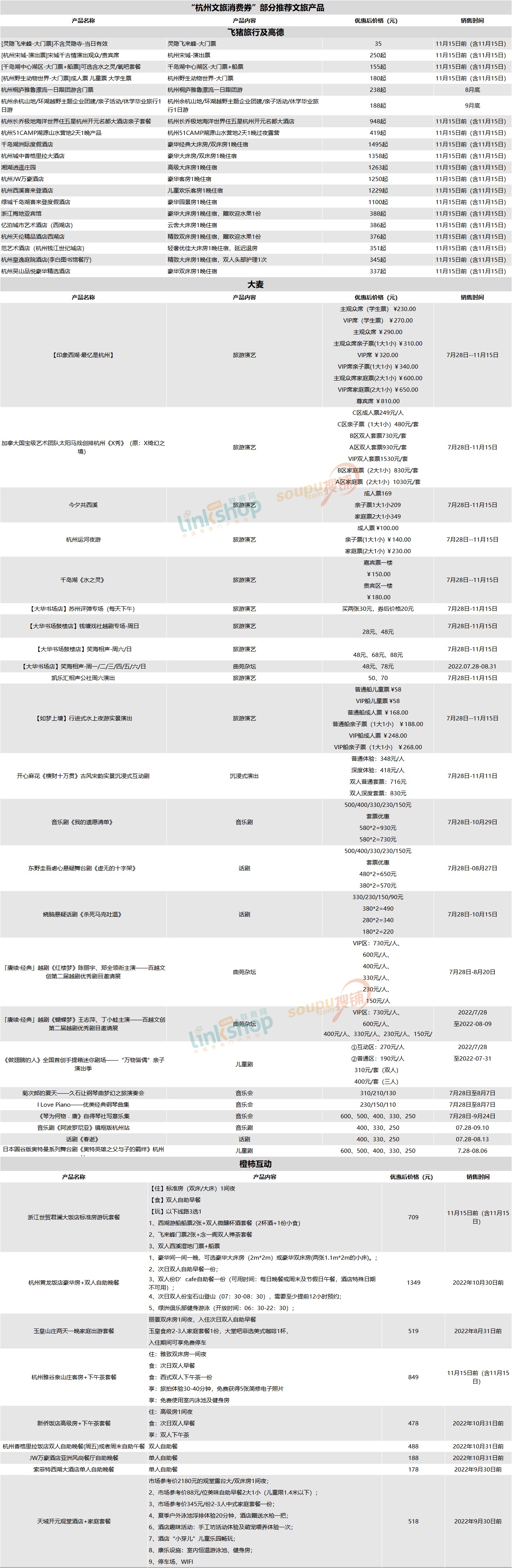 包括:杭州JW萬豪酒店、湘湖逍遙莊園、杭州龍井雷迪森莊園、杭州遠洋凱賓斯基酒店、杭州運河祈利酒店、索菲特西湖大酒店、杭州菲住布渴等酒店推出的住宿、餐飲和體驗產(chǎn)品;杭州詩莉莉漫戈塔·天池酒店、西坡千島湖度假酒店、無它心舍(臨安龍門秘境店)等特色民宿的住宿;宋城、飛來峰、西溪濕地、千島湖、杭州野生動物世界等杭州景區(qū)景點門票;以及杭州《X秀》《最憶是杭州》《宋城千古情》《如夢上塘》《今夕共西溪》等旅游演藝和話劇、音樂劇、兒童劇、音樂會等680余場。