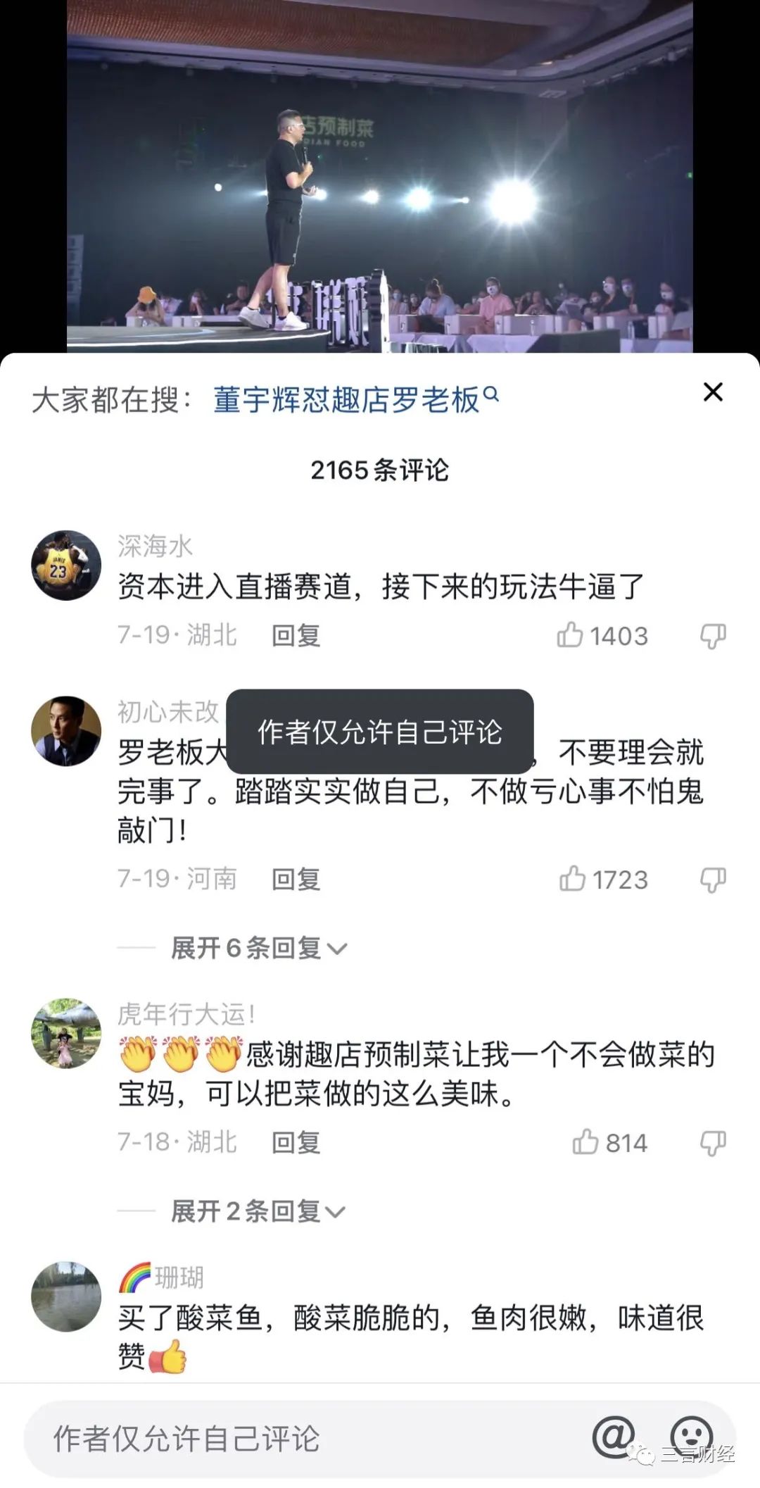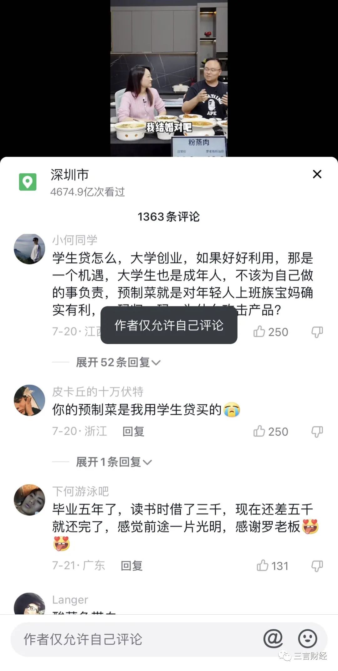 在這波預(yù)制菜創(chuàng)業(yè)中,羅敏先是憑借“一分錢(qián)買(mǎi)酸菜魚(yú)”狂漲粉400萬(wàn),第二天就被東方甄選拉黑,做學(xué)生貸的歷史被扒出,預(yù)制菜向加盟商放貸,被質(zhì)疑“割韭菜”,輿論急速發(fā)酵。