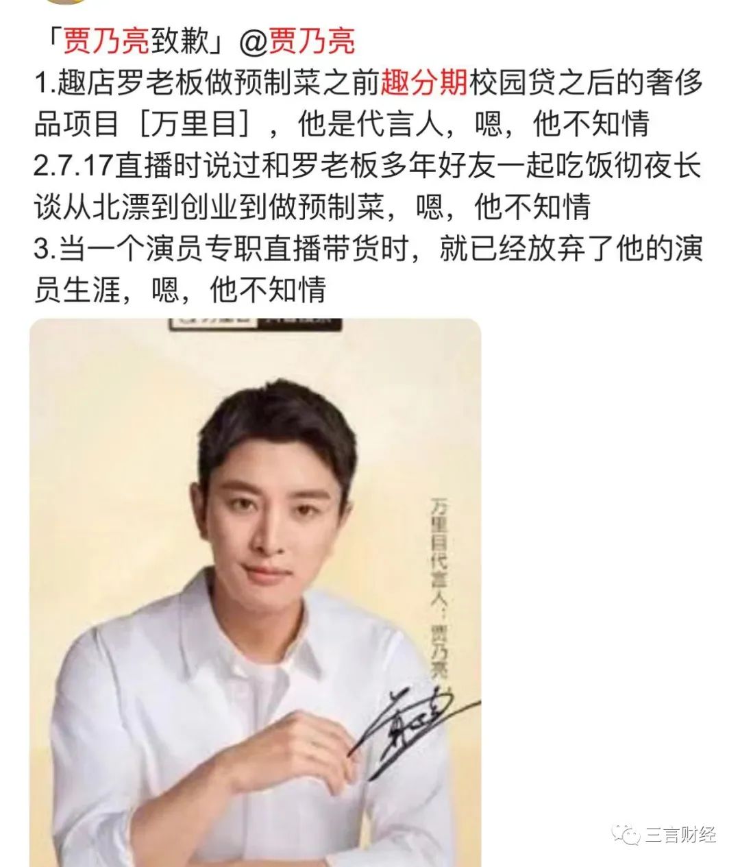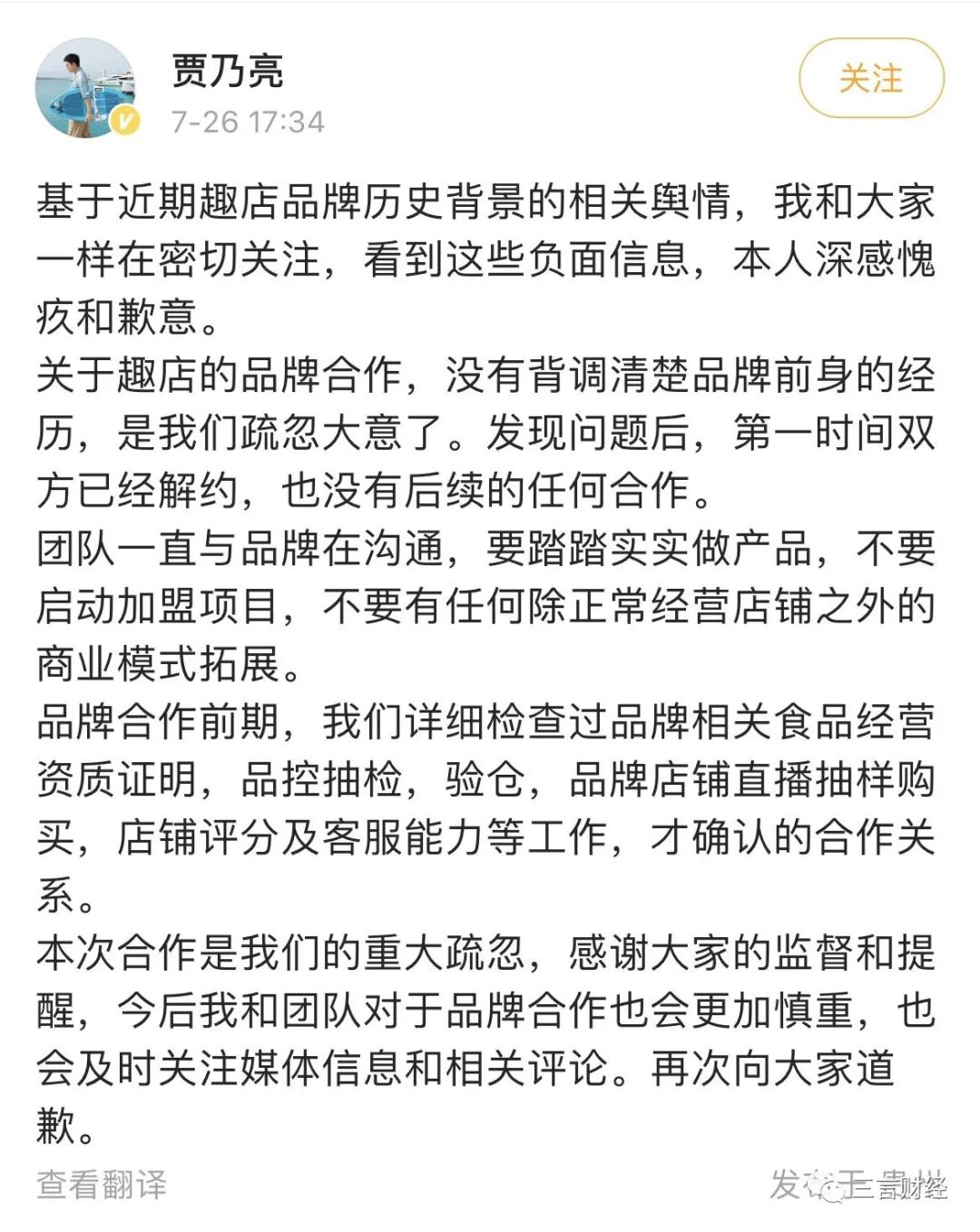 賈乃亮也同樣表示沒(méi)有背調(diào)清楚品牌的前身,“疏忽大意了”,并稱(chēng)已在第一時(shí)間解約,也沒(méi)有后續(xù)的任何合作。