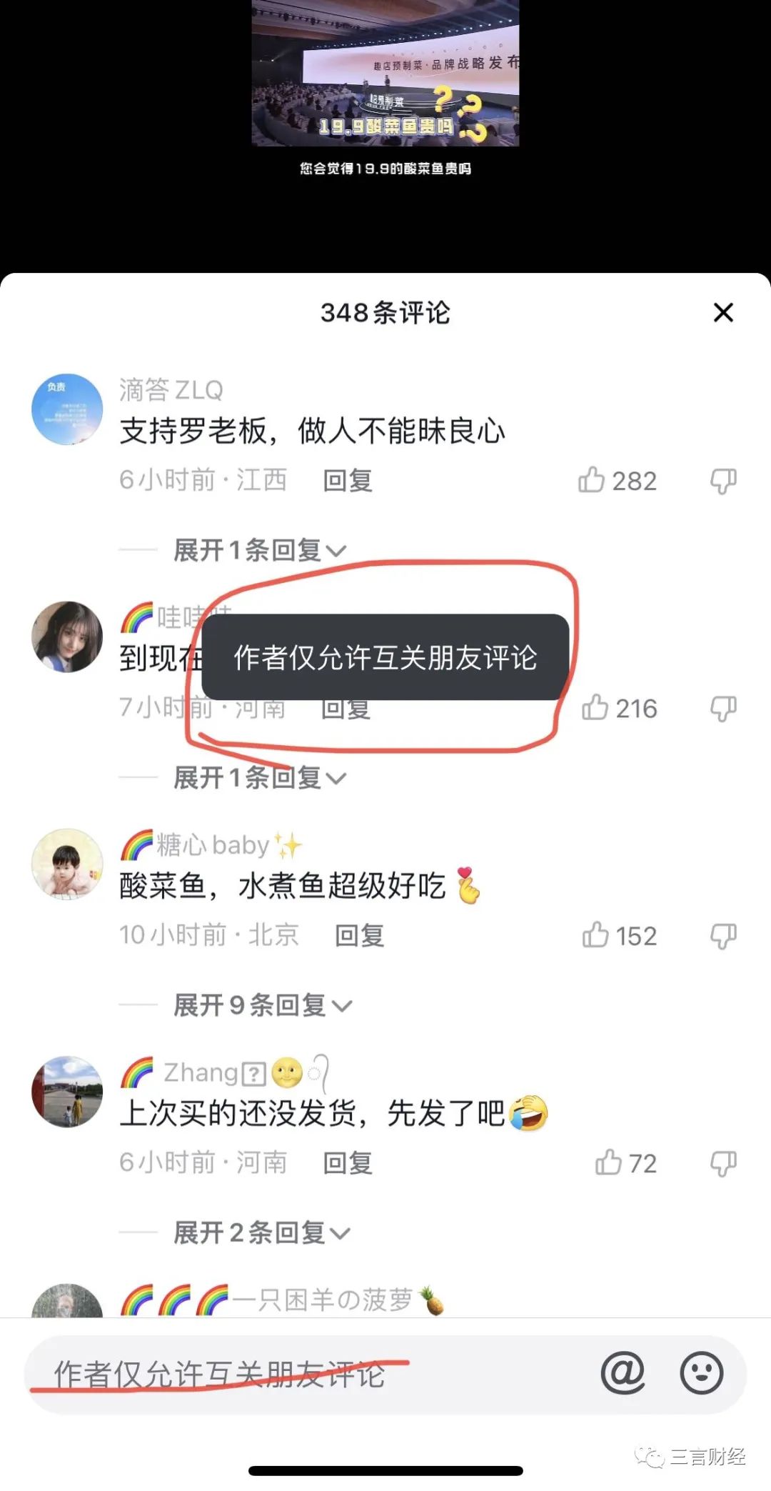 值得注意的是,羅敏賬號(hào)下視頻均設(shè)置了“僅允許互關(guān)朋友評(píng)論”。尤其是18號(hào)預(yù)制菜發(fā)布會(huì)的視頻甚至設(shè)置成了“僅允許自己評(píng)論”。這意味現(xiàn)在不能進(jìn)行任何評(píng)論。