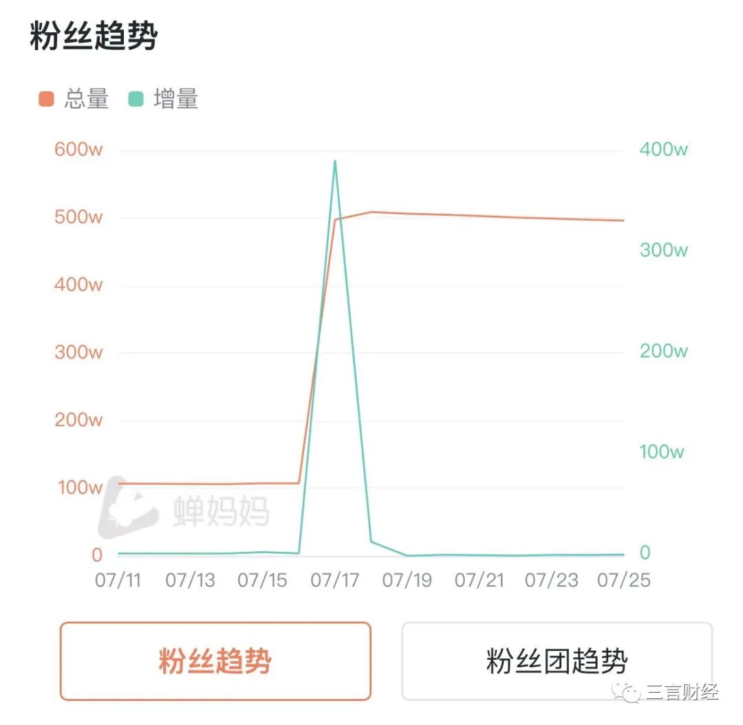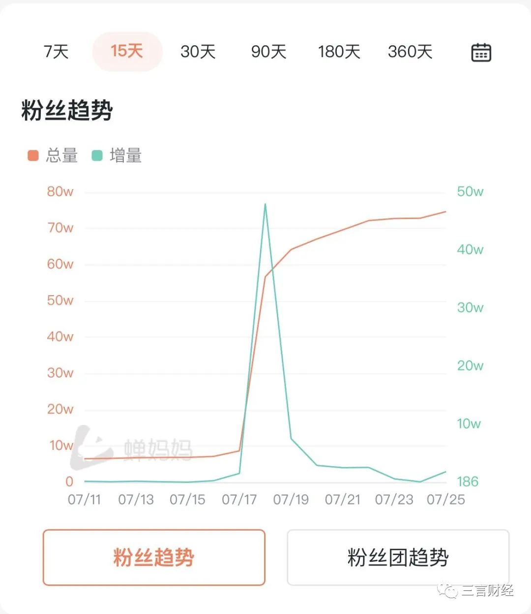據(jù)第三方平臺(tái)數(shù)據(jù),該賬號(hào)也是從17號(hào)開(kāi)始漲粉,從不到10萬(wàn)粉到現(xiàn)在的75.6萬(wàn)。