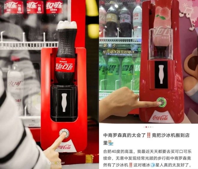 此前,可口可樂已經(jīng)在日本、泰國等國家試水“凝冰機”,掀起了一波熱潮,當時不少國內(nèi)網(wǎng)友也表示羨慕。我們發(fā)現(xiàn),最近國內(nèi)有不少便利店、主題樂園等渠道已經(jīng)陸續(xù)鋪設(shè)了可口可樂的“凝冰機”,吸引了許多美食KOL、網(wǎng)友打卡。
