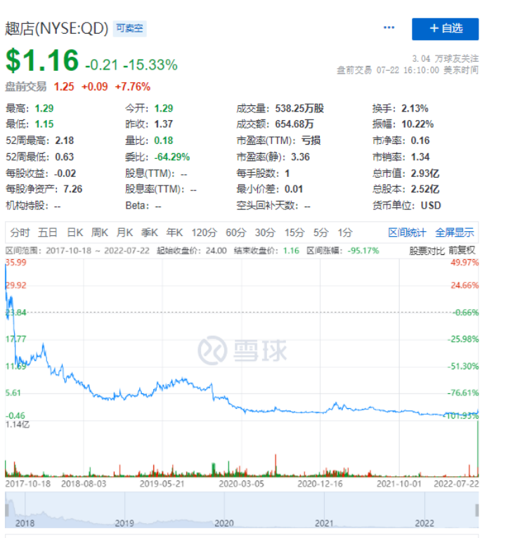 這個在上市時被稱為“中國最會賺錢的公司”,曾經(jīng)輝煌,但在監(jiān)管鐵拳落下后便一蹶不振。趣店的經(jīng)營狀況一落千丈,2022年Q1財報顯示,總營收為2億元,同比下滑60%。股價也是一降再降,剛上市那會股價接近36美元美股,如今暴跌至1美元,甚至瀕臨退市的困境。