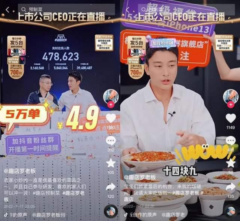 時間拉回到10天前,7月17日,抖音上一個打著“上市公司CEO正在直播”旗號的直播間火了,直播間里是羅敏和明星賈乃亮共同直播賣貨,以一分錢搶酸菜魚加送一千五百臺iPhone13的活動力度,賺足了觀眾的好奇和噱頭,風頭甚至蓋過了隔壁的“東方甄選”。