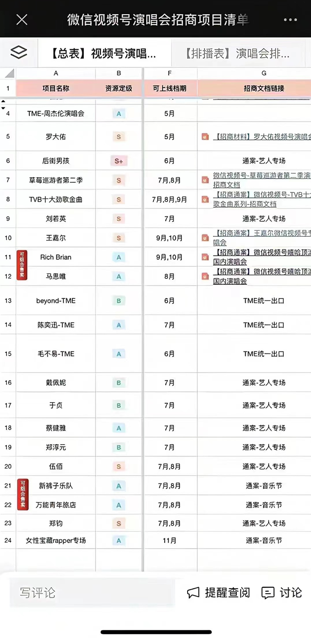 一份流傳甚廣的視頻號(hào)演唱會(huì)招商項(xiàng)目清單顯示,視頻號(hào)的演唱會(huì)排期已經(jīng)排到了年底,待出場(chǎng)歌手不僅包括劉若英、陳奕迅、蔡健雅等“狙擊”情懷的歌手,也開始覆蓋王嘉爾等年輕一派的歌手。
