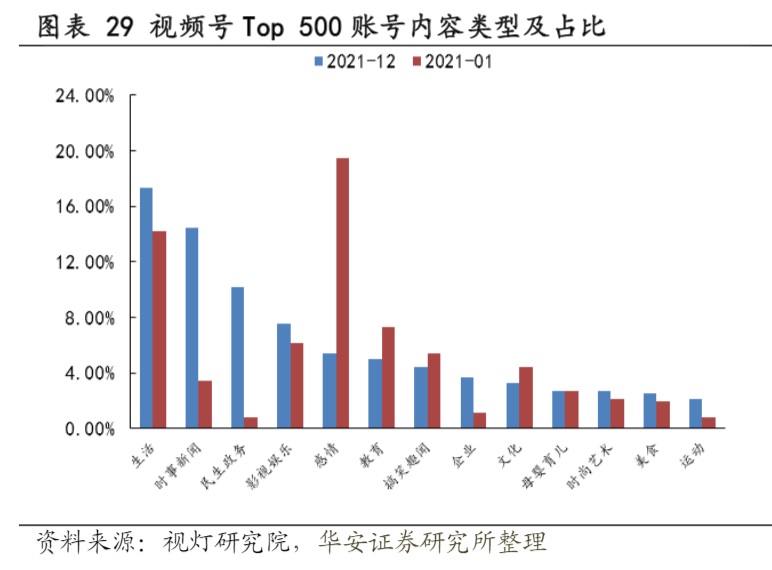 從內(nèi)容生態(tài)來看,相比起抖音生態(tài)的多樣性,視頻號(hào)的內(nèi)容生態(tài)原本就略顯單薄。華安證券研報(bào)顯示,視頻號(hào)TOP 500賬號(hào)中,時(shí)事新聞和民政政務(wù)類共占認(rèn)證賬號(hào)的49.1%。