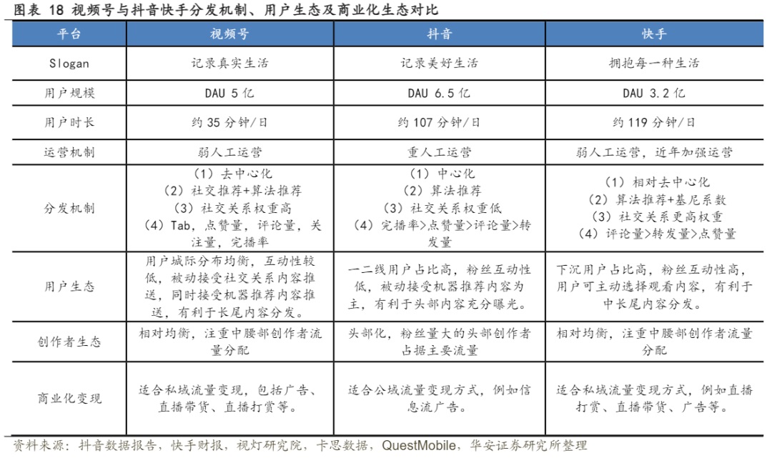 通過融入微信生態(tài)的方式,視頻號(hào)日活迅速上漲,視燈研究院數(shù)據(jù)顯示,2021年年末視頻號(hào)DAU達(dá)到5億,超越了快手的3.2億,但僅35分鐘的用戶時(shí)長(zhǎng)卻遠(yuǎn)遠(yuǎn)落后于抖快。