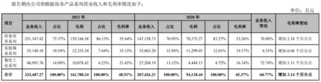 2021年,公司營(yíng)收44.8億,同比增長(zhǎng)57.31%,凈利潤(rùn)1.5億,同比增長(zhǎng)160.60%。奶酪板塊營(yíng)收33.3億,其中奶酪棒的即食營(yíng)養(yǎng)系列25.1億,餐飲工業(yè)4.7億,家庭餐桌3.5億。