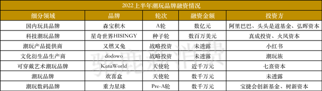 有意思的是,在泡泡瑪特股價(jià)遭遇大跌和在新消費(fèi)市場(chǎng)整體遇冷的大環(huán)境下,仍有大量資本流入潮玩市場(chǎng)賽道。根據(jù)駝鹿新消費(fèi)不完全統(tǒng)計(jì),2022年上半年國(guó)內(nèi)有7個(gè)潮玩品牌獲得融資,融資金額達(dá)到數(shù)億元。