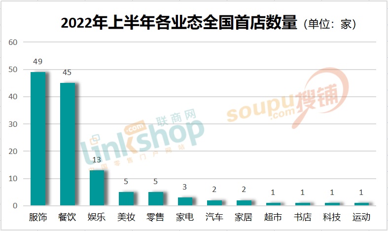 統(tǒng)計(jì)顯示,上半年共開(kāi)出130家全國(guó)首店,其中服飾49家,占比38%,餐飲45家,占比35%,娛樂(lè)13家,占比10%,其余業(yè)態(tài)如美妝、零售、家電、汽車(chē)等占比較少。