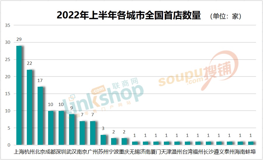 在首店選址上,上海仍然是品牌入駐中國(guó)的第一選擇,以29家首店位列榜首,杭州以22家首店的成績(jī)排名第二,北京以17家首店排名第三,成都、深圳以10家并列排名第四,另外,武漢、南京、廣州也是首店?duì)帄Z戰(zhàn)中較為有力的參與者,基本開(kāi)出了7、9家首店。