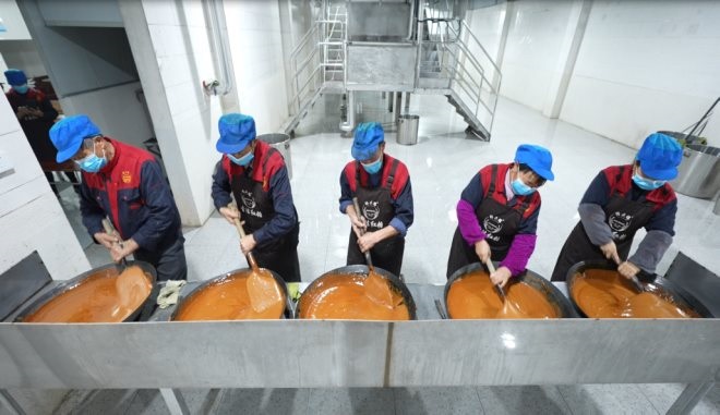 ▲師傅們正古法煉制紅糖。 攝影 何聚
