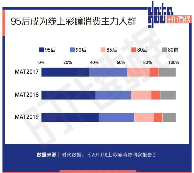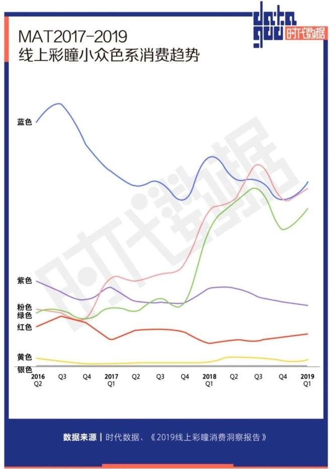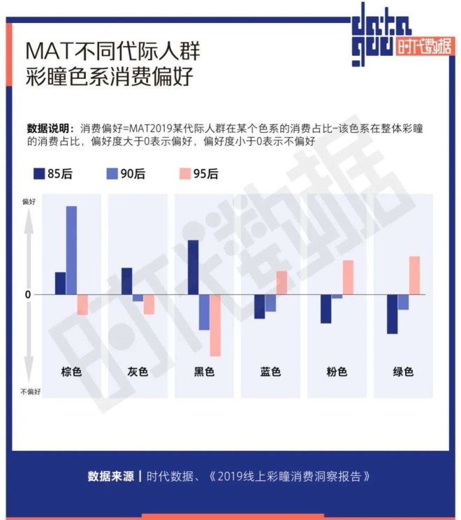 數據顯示隨著95后成為彩瞳消費的主力人群,小眾色系開始流行。在色系偏好上,85后偏好更自然的棕色、灰色和黑色,95后則更偏好藍色、粉色和綠色。