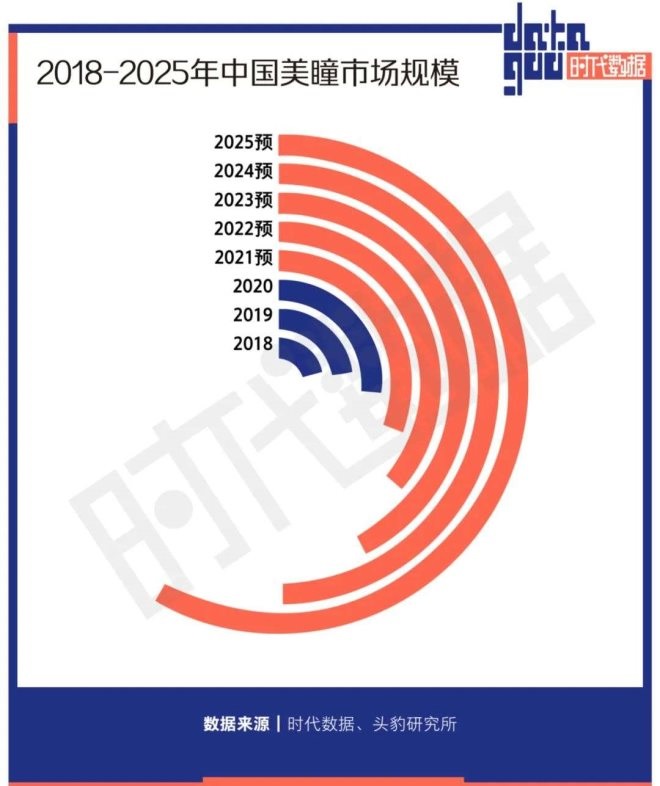 不止于此,相較于歐美國家30%以上的滲透率,中國彩瞳市場目前滲透率僅7.5%,還擁有著至少4倍的成長空間。Mob研究院預測,到2025年,中國彩瞳行業(yè)市場規(guī)模將達到500億元,有望成為全球最重要的市場。