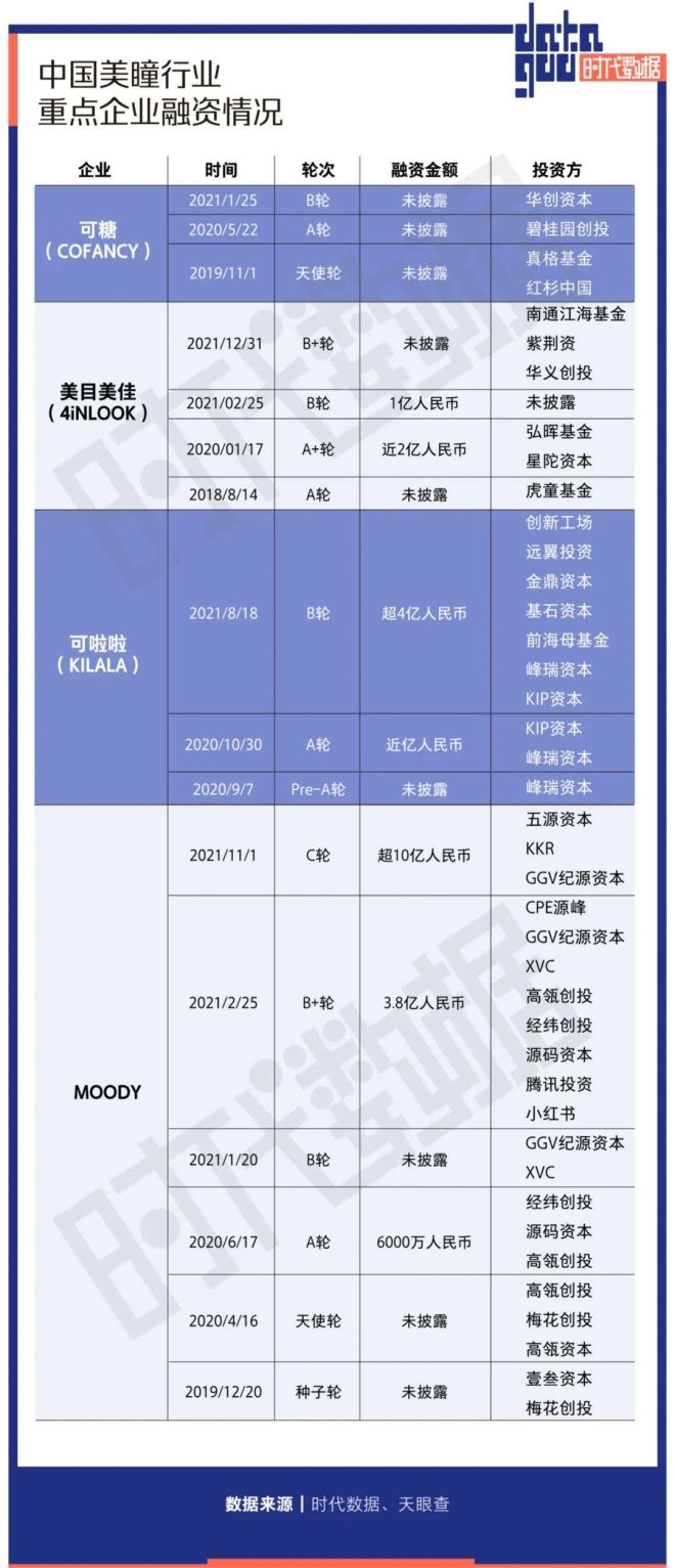 當下火熱的國貨美瞳品牌在過去兩年扎堆收獲融資,可糖(COFANCY)于2021年1月獲華創(chuàng)資本等股權融資,可啦啦(KILALA)2021年8月獲超4億元B輪融資,美目美佳(4iNLOOK)在過去一年時間內接連完成2輪融資,2021年11月MOODY獲得超10億元C輪融資,成為目前美瞳行業(yè)最大的一筆融資。