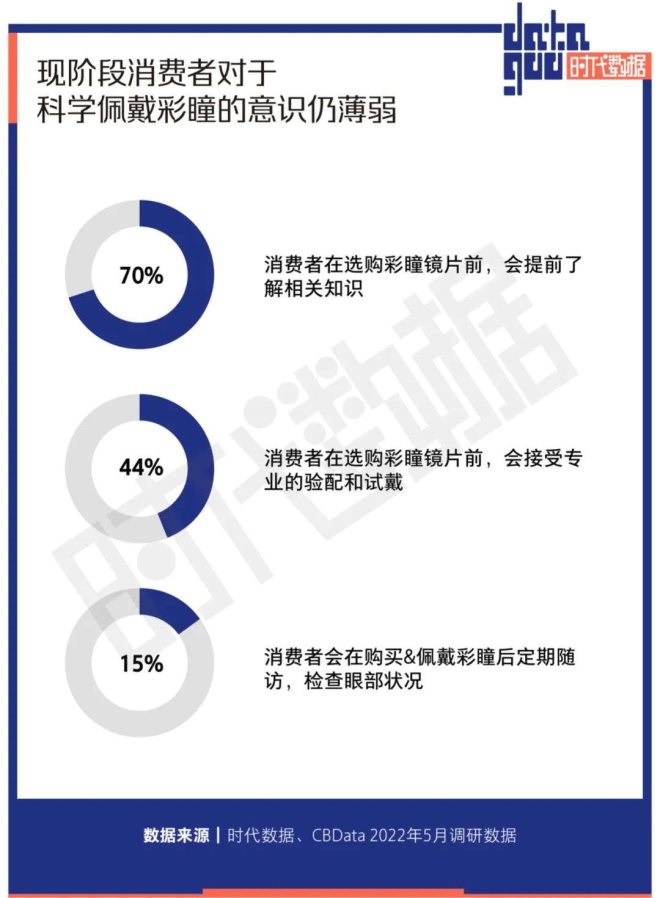 《2022中國彩瞳行業(yè)指南》調研數據顯示,盡管有七成消費者在選購彩瞳鏡片前會提前了解相關知識,但在選購彩瞳鏡片前,接受專業(yè)驗配和試戴的消費者不超過五成,而在購買&配戴彩瞳后,能夠定期隨訪檢查眼部狀況的消費者僅超過一成,多數消費者尚未形成科學的彩瞳配戴意識和習慣。