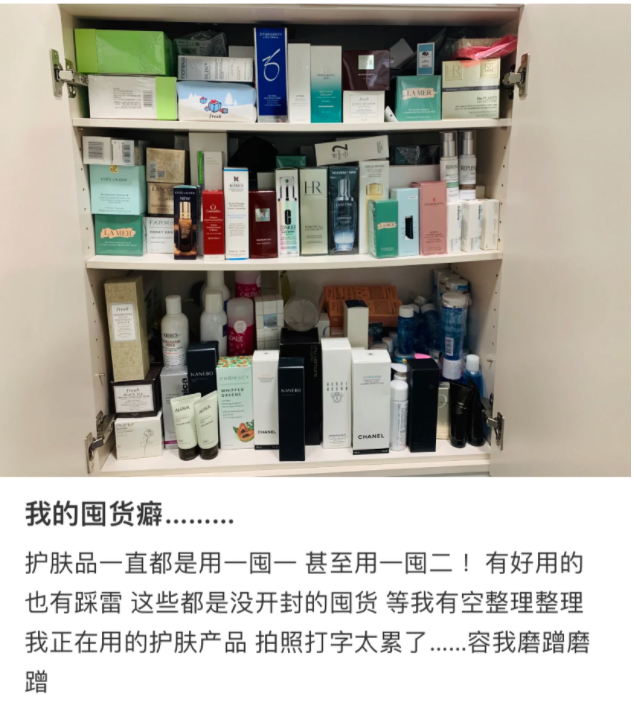 有用戶囤積的大牌護膚品已經(jīng)將柜子壓彎 圖源 / “愛吃榴蓮的DD”