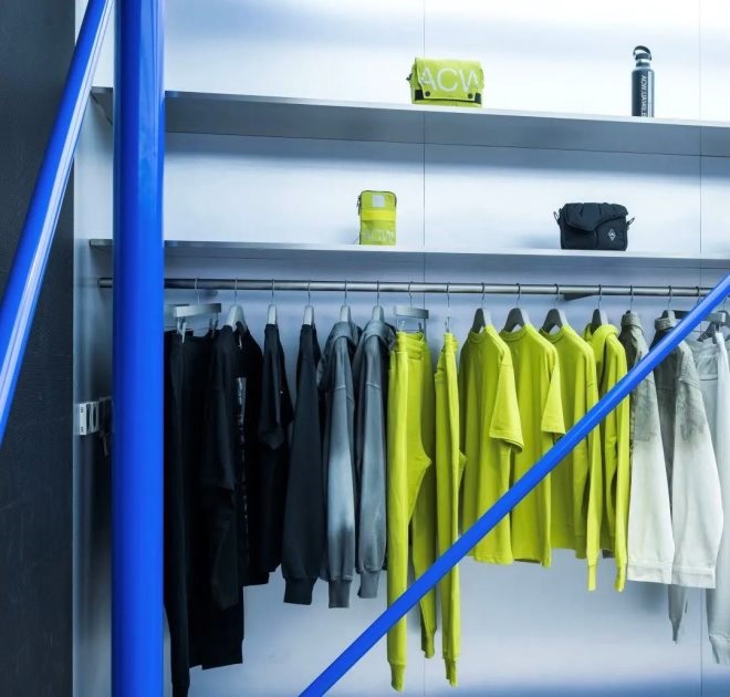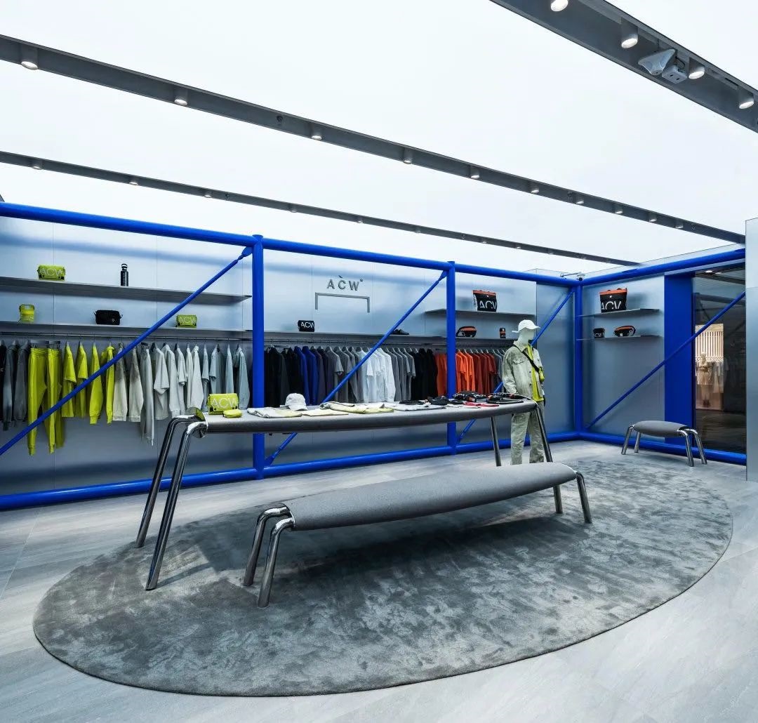 中國首店根植于英國現(xiàn)代建筑美學理論,打造全新沉浸式交互體驗。藝術家兼品牌創(chuàng)始人Samuel Ross為店鋪空間注入鮮明的工業(yè)風格,以ACW*獨有的伏特藍為主色調,多層次觸感連結碰撞,切身感受品牌的工業(yè)美學與建筑美學。