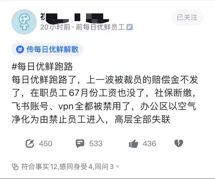 對于裁員一事,早在7月上旬就已有每日優(yōu)鮮員工在脈脈上進行爆料。有認(rèn)證為每日優(yōu)鮮前員工的用戶稱,“在職員工6、7月份工資也沒了,社保斷繳”等。另有員工稱,每日優(yōu)鮮裁員從3、4月份便已開始,原來2000多名員工,現(xiàn)今不足900人。
