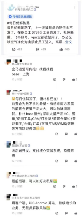 圖注:每日優(yōu)鮮前員工發(fā)帖 部分企業(yè)在該帖回復(fù)下面招聘