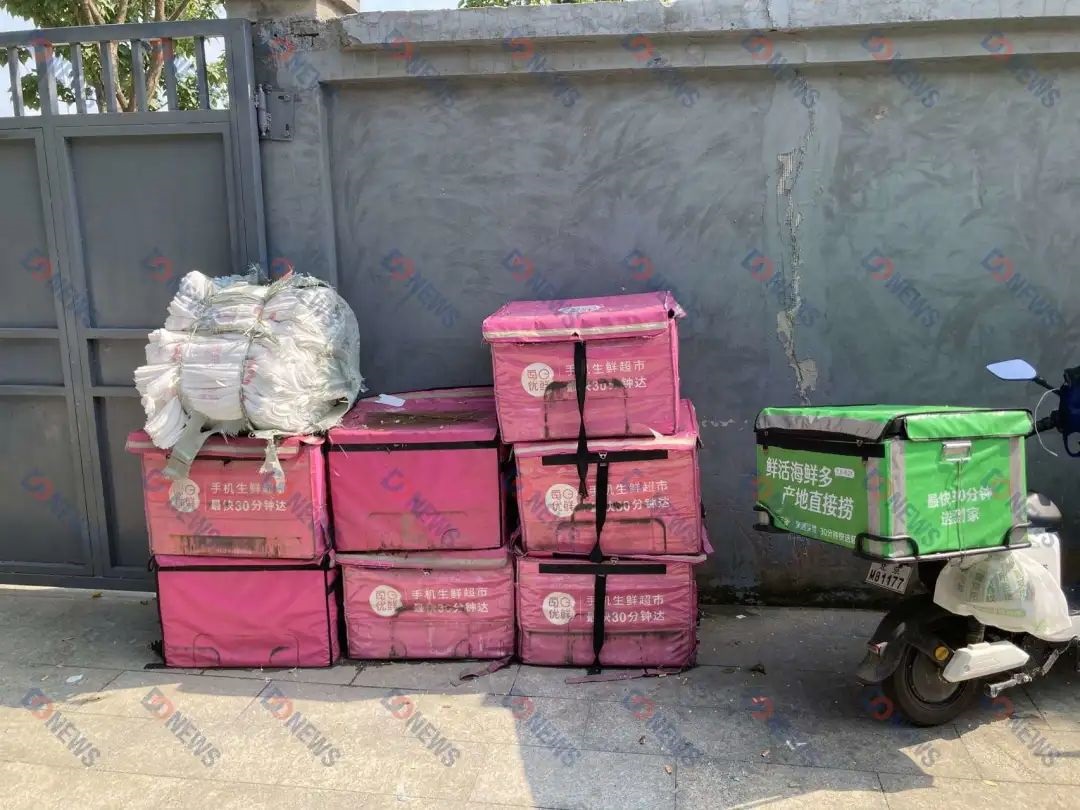 圖注:前置倉門口每日優(yōu)鮮和美團買菜的箱子