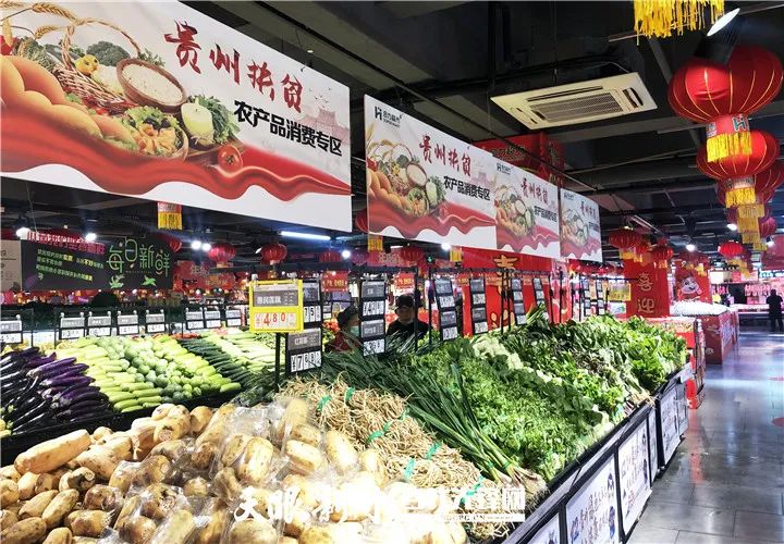 合力惠民生鮮超市內(nèi),貴州扶貧農(nóng)產(chǎn)品消費(fèi)專區(qū)擺滿了各種生鮮果蔬