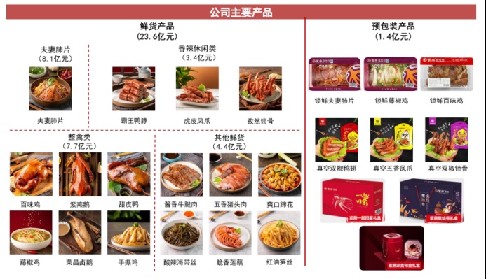 有別于鹵制品市場主流的鴨副產(chǎn)品,佐餐鹵味在食材和口感上更為豐富,主要涵蓋雞、牛、豬等肉類及素菜制品。紫燕食品的爆款產(chǎn)品夫妻肺片屬于川味名菜,由于紫燕百味雞的主市場分布在華東地區(qū),紫燕根據(jù)不同區(qū)域和市場的飲食習慣差異,通過自制配方改良了口味,以便符合當?shù)氐娘嬍澄幕,因此成為了可全國化?fù)制的大單品。紫燕食品的產(chǎn)品還包括百味雞、藤椒雞、甜皮鴨等整禽類產(chǎn)品,也兼具了甜、咸、辣等多種口味,以便消費者挑選適合的“下酒菜”。