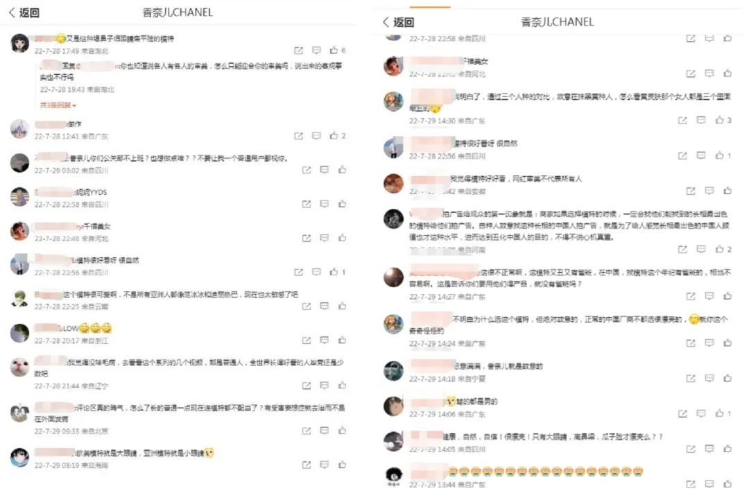 盡管三位模特都是素顏出鏡,不存在妝容的美丑之分,但不同長相的對比之下,不少網(wǎng)友認為品牌選擇亞洲模特的標準帶有刻板印象,紛紛在香奈兒微博賬號下留言稱,“歐美模特就是大眼睛,亞洲模特就是小眼睛”“又是這種塌鼻子細眼睛扁平臉的模特”“感覺有點惡意,這模特和香奈兒氣質完全不符”。