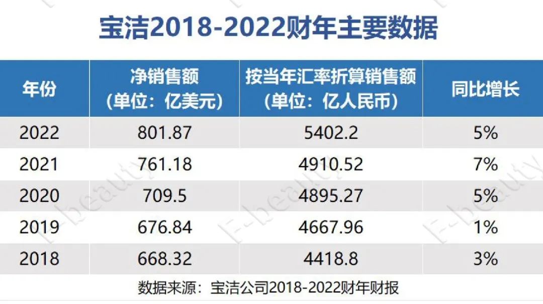 綜合寶潔近5年財(cái)報(bào)數(shù)據(jù)來(lái)看,2022年財(cái)報(bào),寶潔凈銷(xiāo)售額達(dá)到801.87美元,約合人民幣5402.2億元,繼過(guò)去十年保持連續(xù)增長(zhǎng)后,再次創(chuàng)歷史新高,同比增長(zhǎng)為中個(gè)位數(shù)的5%,增速較2021財(cái)年略微放緩。