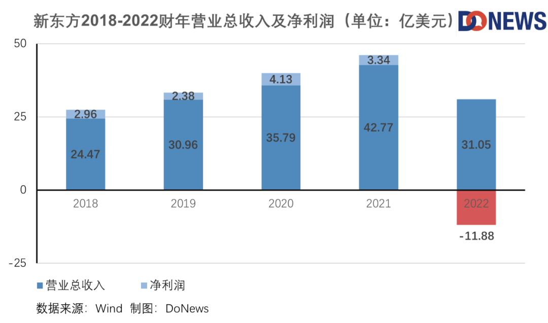 2022財(cái)年,新東方實(shí)現(xiàn)凈營(yíng)收31.05億美元,同比2021財(cái)年的42.77億美元下降27.4%;新東方股東應(yīng)占凈虧損11.88億美元,而2021年為盈利3.34億美元。