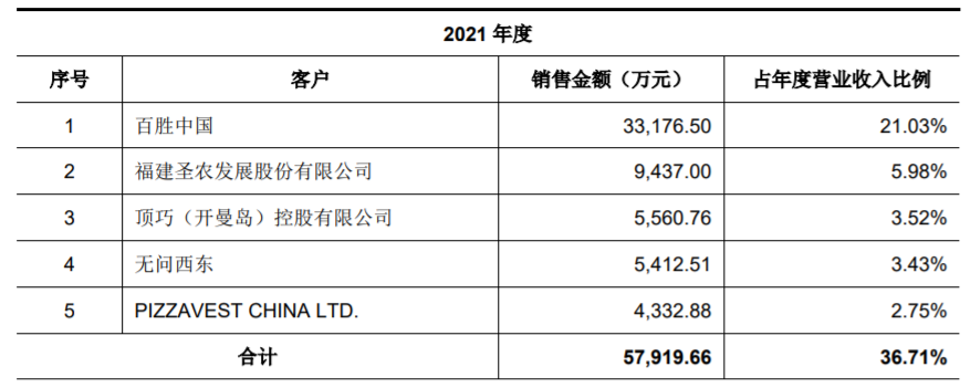 這意味著,寶立食品對(duì)頭部客戶的依賴較為明顯。2019年至2021年,公司對(duì)前五大客戶實(shí)現(xiàn)的銷售收入占公司營(yíng)業(yè)收入的比重分別為50.11%、44.79%和36.71%,公司B 端直銷營(yíng)收總占比高達(dá)85%。其中,與最大客戶百勝中國(guó)合作近20年,近三年銷售收入占比均超過(guò)20%。