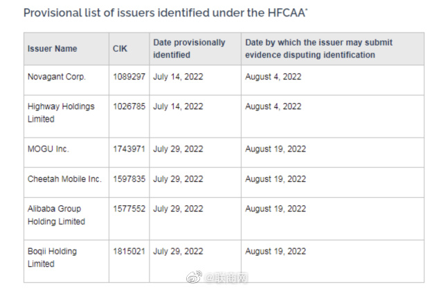 聯(lián)商快訊:美東時(shí)間周五,阿里巴巴被美國證券交易委員會(SEC)列入“預(yù)摘牌”名單。除阿里外,周五被列入名單的其他公司包括蘑菇街、波奇寵物、獵豹移動公司等。