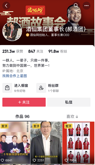 就連酒仙網(wǎng)的創(chuàng)始人 郝鴻峰 也親自加入了公司的 MCN團(tuán)隊(duì),其抖音賬號(hào)“酒仙集團(tuán)董事長(zhǎng)”截止目前也有91.8萬(wàn)粉絲量。