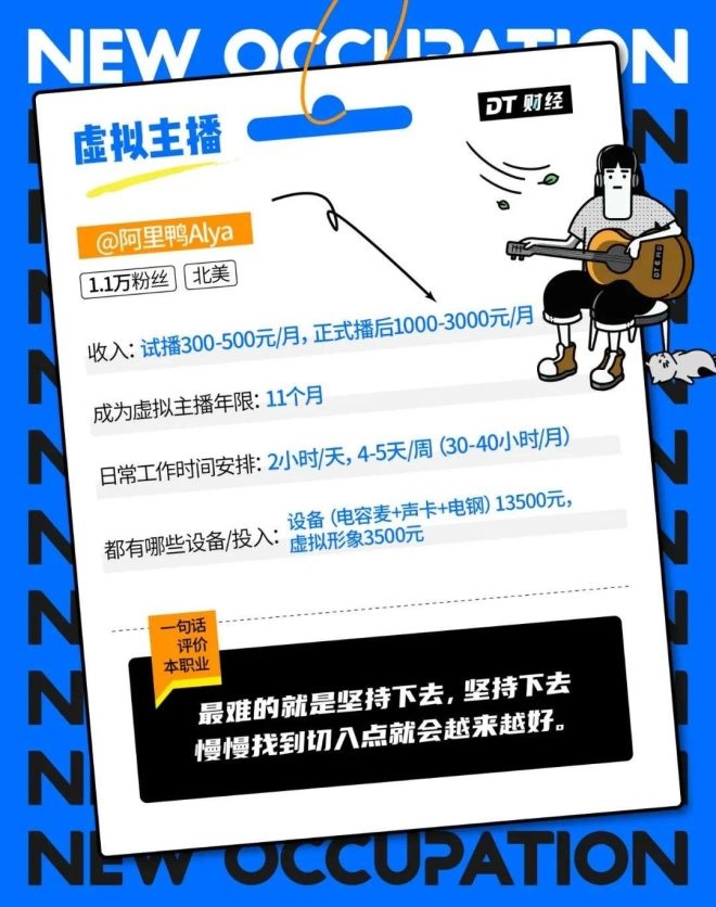 如果真人出鏡,可能就會對本職工作有影響。而阿里鴨在“互聯(lián)網(wǎng)工作,肯定比做音樂賺得多!薄熬退闶荁站整個虛擬主播市場,體量也非常小,而頭部虛擬主播基本拿走了其中大部分,剩下的小V基本上是不賺錢的!