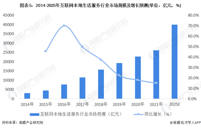 前瞻產(chǎn)業(yè)研究院數(shù)據(jù)顯示,2021年,我國(guó)僅互聯(lián)網(wǎng)本地生活服務(wù)行業(yè)市場(chǎng)規(guī)模達(dá)到2.6萬(wàn)億元,同比增速為15.1%。預(yù)計(jì)到到2025年,市場(chǎng)規(guī)模達(dá)4萬(wàn)億元。但目前,本地生活的整體線上滲透率僅為10%,仍有巨大發(fā)展空間。