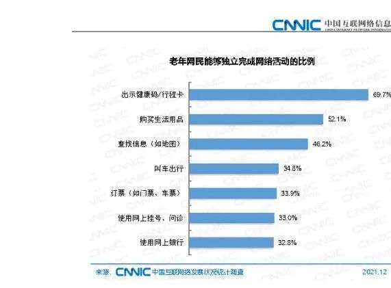 而更細致的數據在于:能獨立完成出示健康碼/行程卡、購買生活用品和查找信息等網絡活動的老年網民比例已分別達69.7%、52.1%和46.2%。