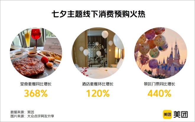 美團(tuán)數(shù)據(jù)顯示,近期“七夕”主題餐飲堂食套餐、景區(qū)門票較去年同期分別增長368%、440%,酒店套餐環(huán)比平日增長120%,提前預(yù)訂七夕當(dāng)天堂食座位的訂單量同比去年亦大幅增長,杭州黑珍珠餐廳超四成已訂滿。