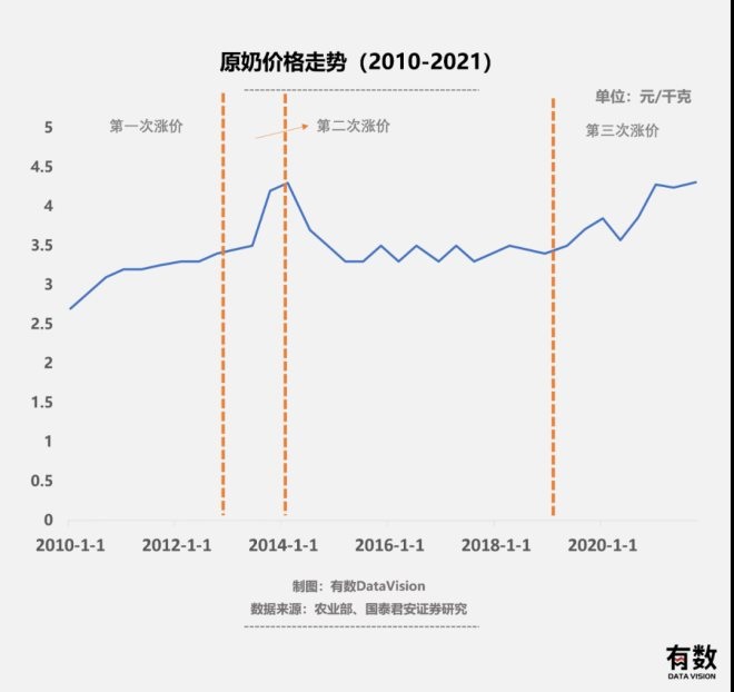 而到了這一輪的奶價(jià)上行期,頭部乳企公司換了種玩法。不光是加速上游牧場(chǎng)整合收購(gòu),還開始推廣生鮮乳,直接導(dǎo)致原奶價(jià)格在2021年攀升到了歷史最高點(diǎn),各主產(chǎn)區(qū)奶價(jià)維持在4.2元/千克的高位。