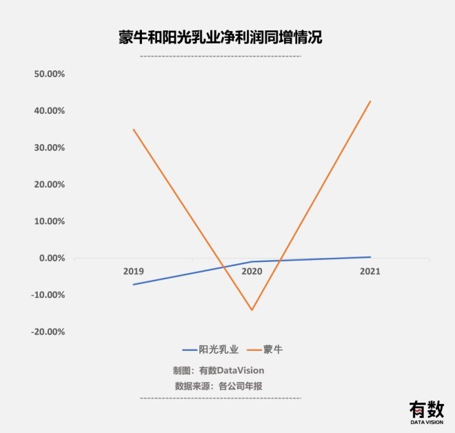 陽(yáng)光乳業(yè)的一部分原奶采購(gòu)自現(xiàn)代牧業(yè),也就是蒙牛的小老弟。于是,陽(yáng)光乳業(yè)一邊苦哈哈過(guò)日子,另一邊,拿捏了奶源的蒙牛卻笑開了花。2021年蒙牛凈利潤(rùn)同增42.6%,產(chǎn)自自家牧場(chǎng)的低溫鮮奶“每日鮮語(yǔ)”功不可沒。
