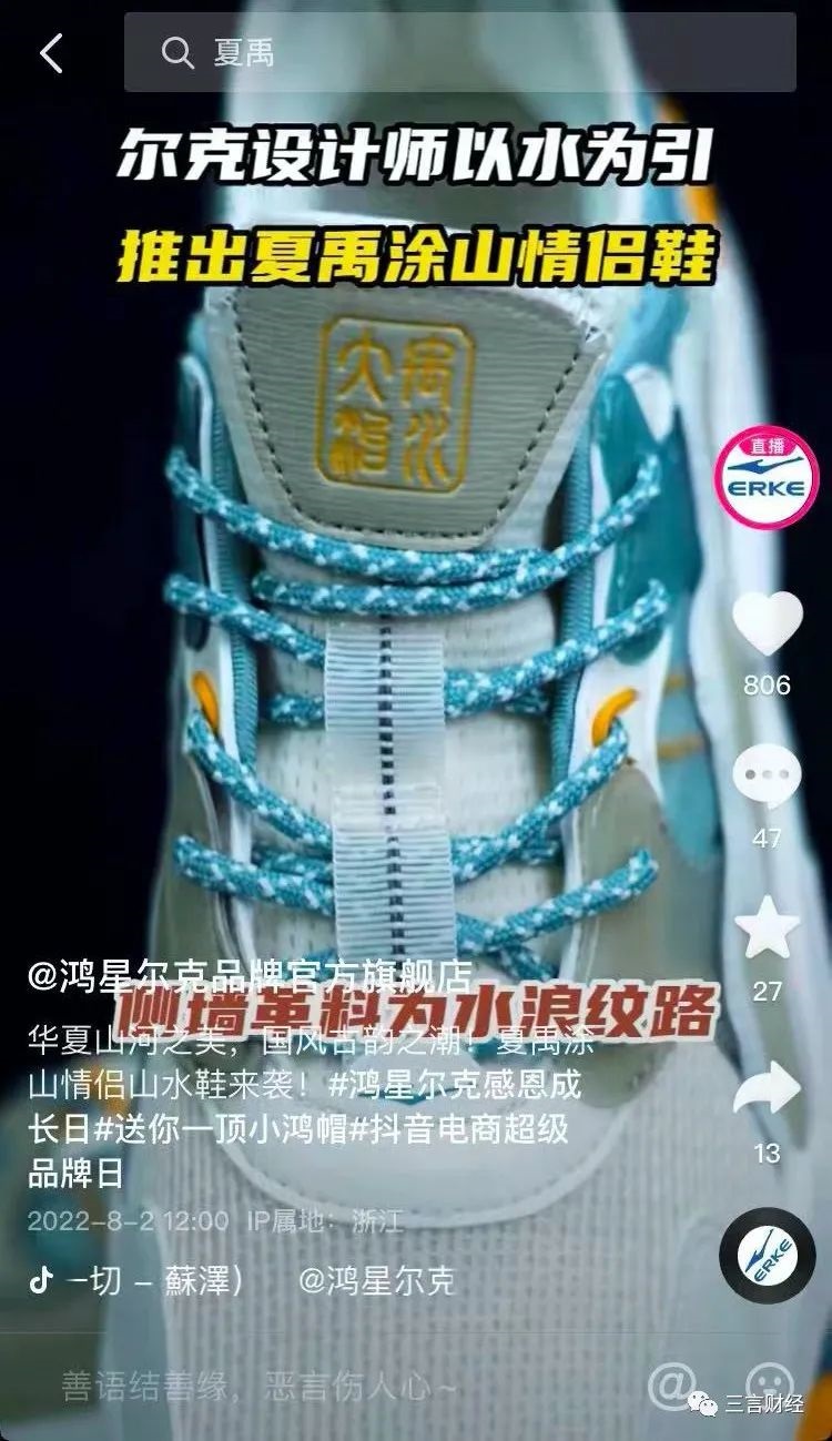 比如這款以水為引的夏禹涂山情侶鞋。鴻星爾克曾多次在其抖音賬號(hào)發(fā)布相關(guān)視頻來(lái)宣傳。